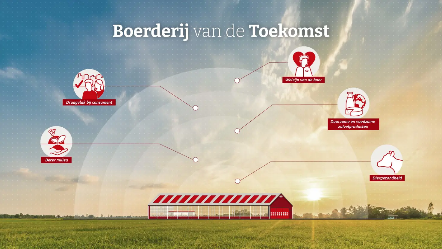 Terwijl de omgeving verandert, blijft ons doel hetzelfde: 'Het leven van veehouders gemakkelijker maken.' De komende jaren zullen we blijven innoveren om de grote uitdagingen in de melkveehouderij te helpen oplossen. Onze innovaties zullen zijn gebaseerd op de vijf thema's die in de Boerderij van de Toekomst centraal staan.